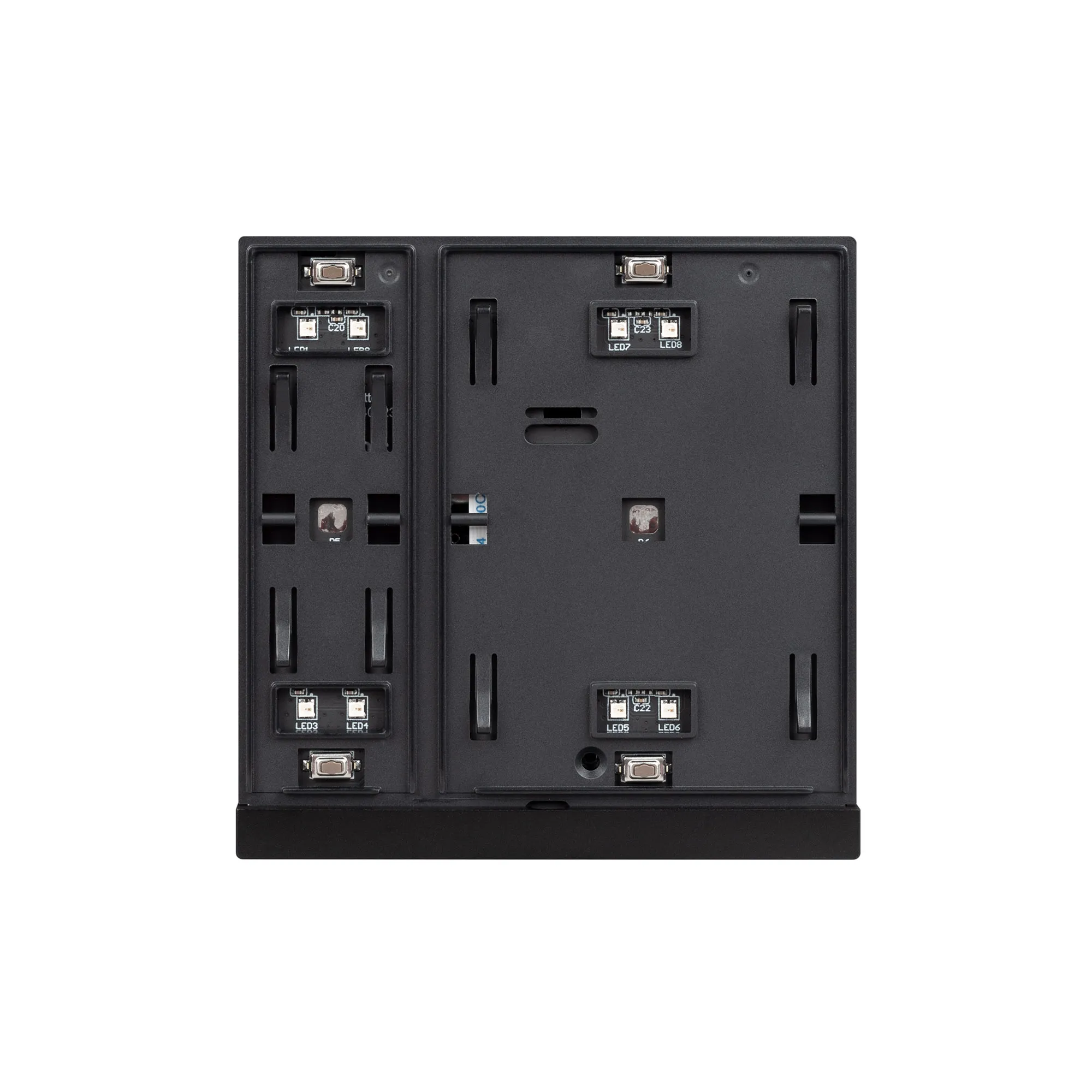 Механизм универсальной многофункциональной встраиваемой настенной панели для систем KNX. 2 клавиши, светодиодная индикация. Наличие функции KNX Secure. Безрамочный корпус черного цвета, материал - пластик, светодиодная индикация (настраиваемая RGB палитра индикации). В механизме панели предусмотрено 2 дополнительных бинарных входа для подключения датчиков температуры NTC или выключателей. Питание от шины KNX DC 21-30V. Габариты 86x86x33 мм.