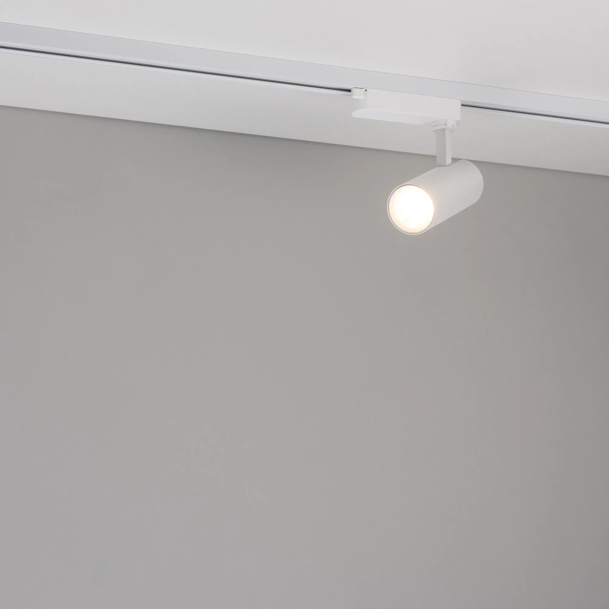 Светильник для треков/шин 2 провода. Мощность 10 Вт, св. поток без решетки honeycomb 1000 лм, 100 лм/Вт, с решеткой honeycomb 660 лм, 66 лм/Вт, дневной 4000 K, CRI>90, угол 15°, напряжение питания 230 В. Белый круглый корпус из алюминия, материал линзы PMMA, степень защиты IP20. Размер: диаметр 55 мм, длина световой части 141 мм. Монтаж на трек 1-фазный. Драйвер встроенный 25-40 В, 250мА., пульсация <5%.