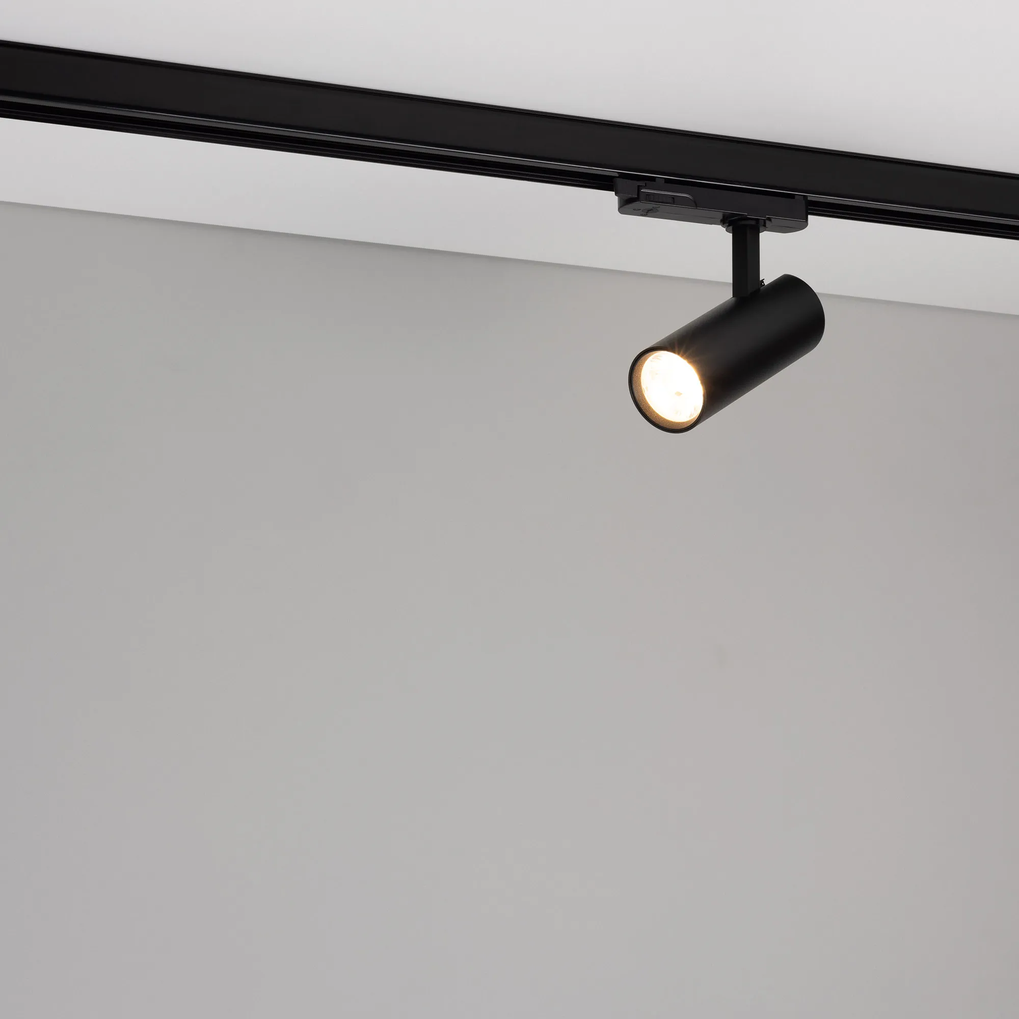 Светильник для треков/шин 4 провода. Мощность 10 Вт, св. поток без решетки honeycomb 1000 лм, 100 лм/Вт, с решеткой honeycomb 660 лм, 66 лм/Вт, дневной 4000 K, CRI>90, угол 36°, напряжение питания 230 В. Черный круглый корпус из алюминия, материал линзы PMMA, степень защиты IP20. Размер: диаметр 55 мм, длина световой части 141 мм. Монтаж на трек 3-фазный. Драйвер встроенный 24-42 В, 250мА., пульсация <5%.