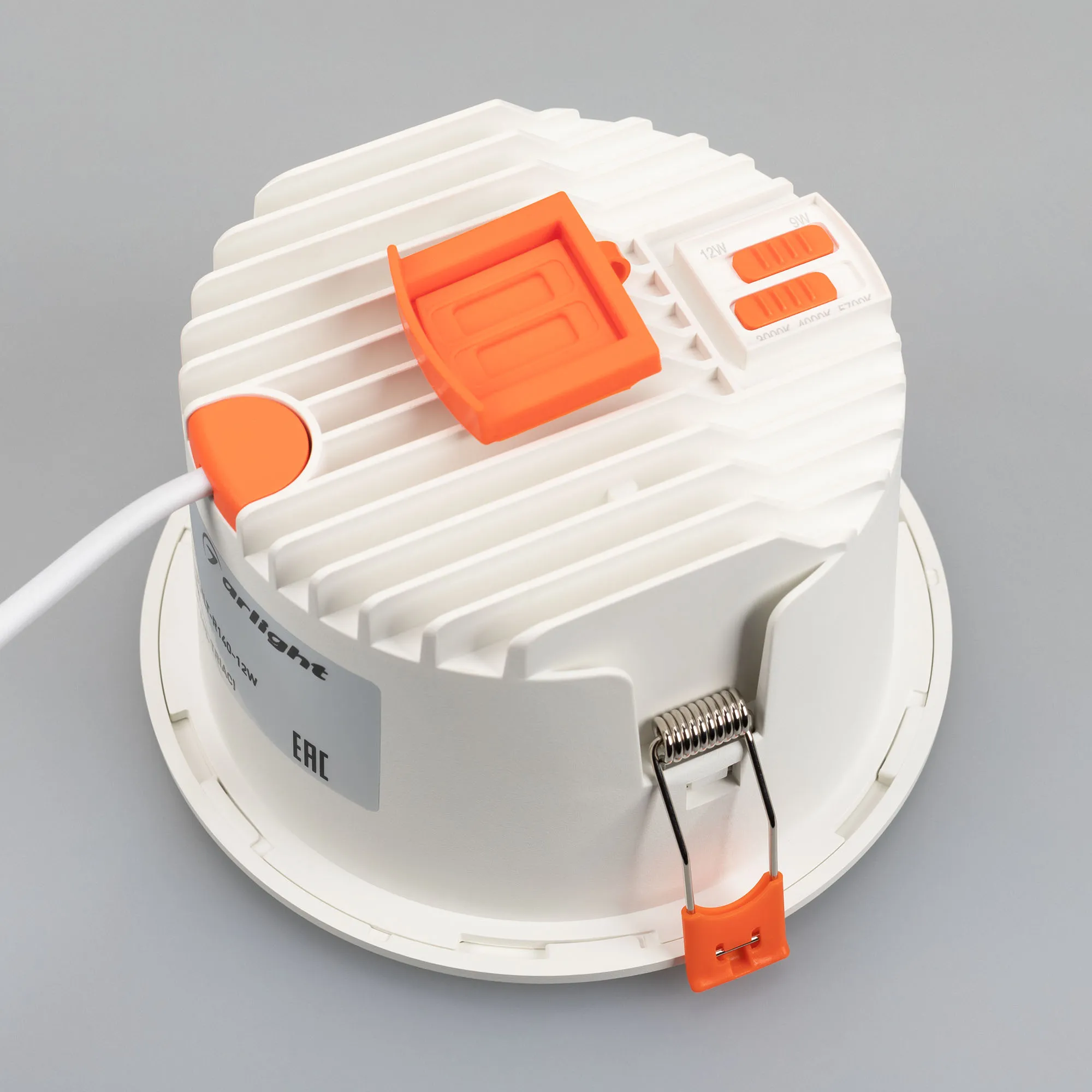 Встраиваемый светильник даунлайт с изменяемой мощностью и цветовой температурой. Мощность 9-12 Вт, св. поток 950-1310лм, 100 лм/Вт, цветовая температура 3000-4000-5700 K, CRI>90, угол 40°, напряжение питания 230 В. Белый круглый корпус, степень защиты IP54. Размер: диаметр 140 мм, высота 80 мм. Монтаж встраиваемый, установочное отверстие: диаметр 122-127 мм. TRIAC-драйвер, пульсация <1%.