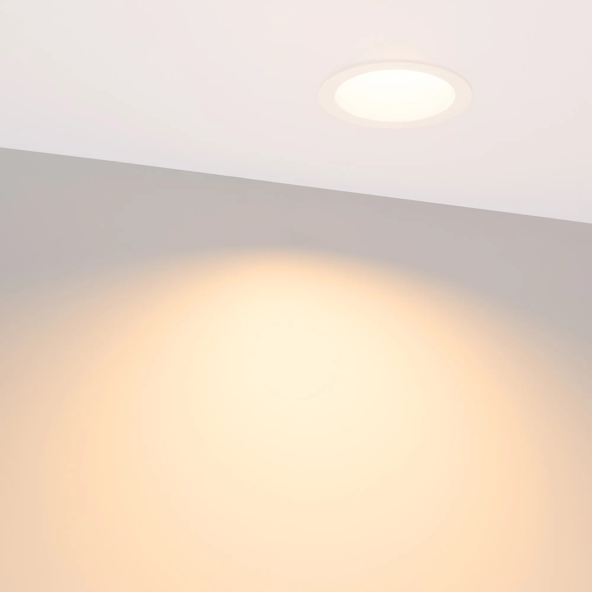 Встраиваемый светильник даунлайт. Мощность 8 Вт, св. поток 610 лм, 76 лм/Вт, тёплый 2700 K, CRI>90, угол 85°, напряжение питания 230 В. Белый круглый корпус из алюминия, степень защиты IP54. Размер: диаметр 84 мм, высота 49 мм. Монтаж встраиваемый, установочное отверстие: диаметр 75 мм. Драйвер 30-45 В, 200 мА, пульсация <3%.