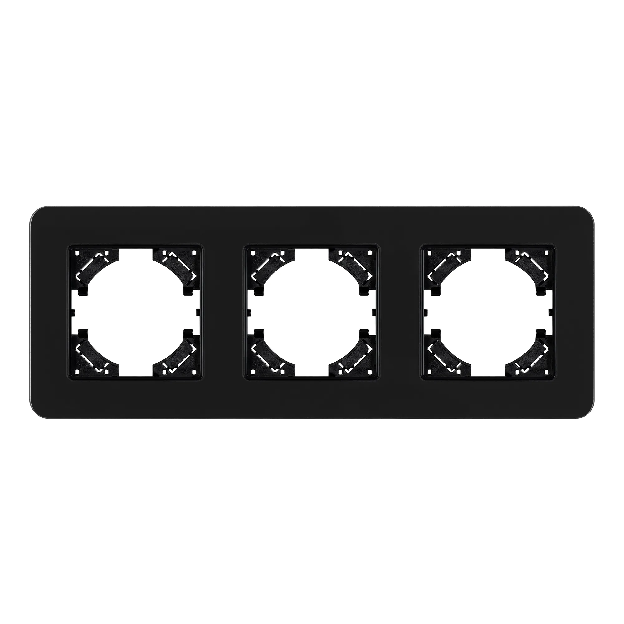 Рамка стеклянная на 3 поста, под встраиваемый механизм. Цвет - черный с Soft-Touch покрытием. Уровень герметичности IP20. Ориентация монтажа - горизонтальная (основным ориентиром служат посадочные выступы для накладки механизма).