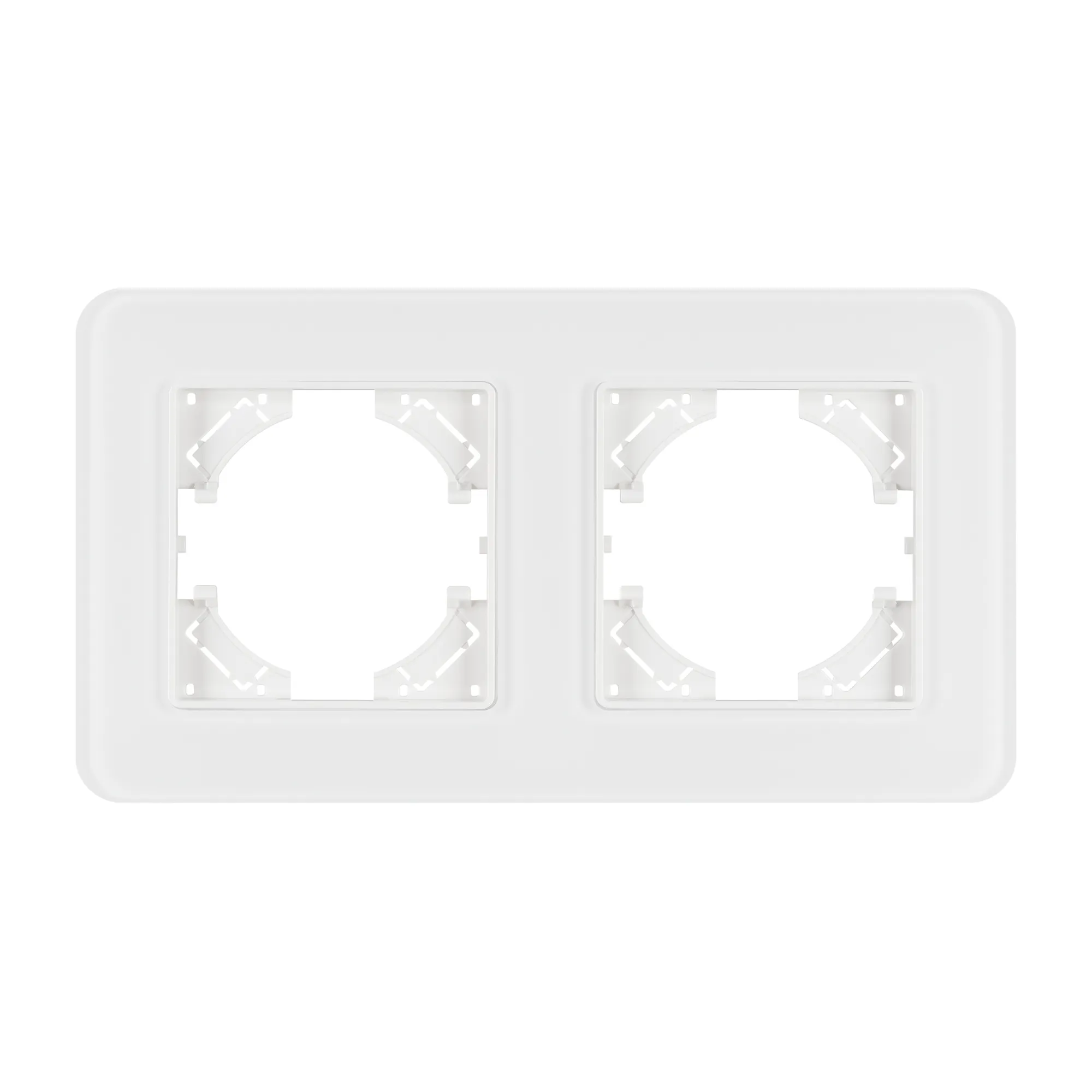 Рамка стеклянная на 2 поста, под встраиваемый механизм. Цвет - белый с Soft-Touch покрытием. Уровень герметичности IP20. Ориентация монтажа - горизонтальная (основным ориентиром служат посадочные выступы для накладки механизма).