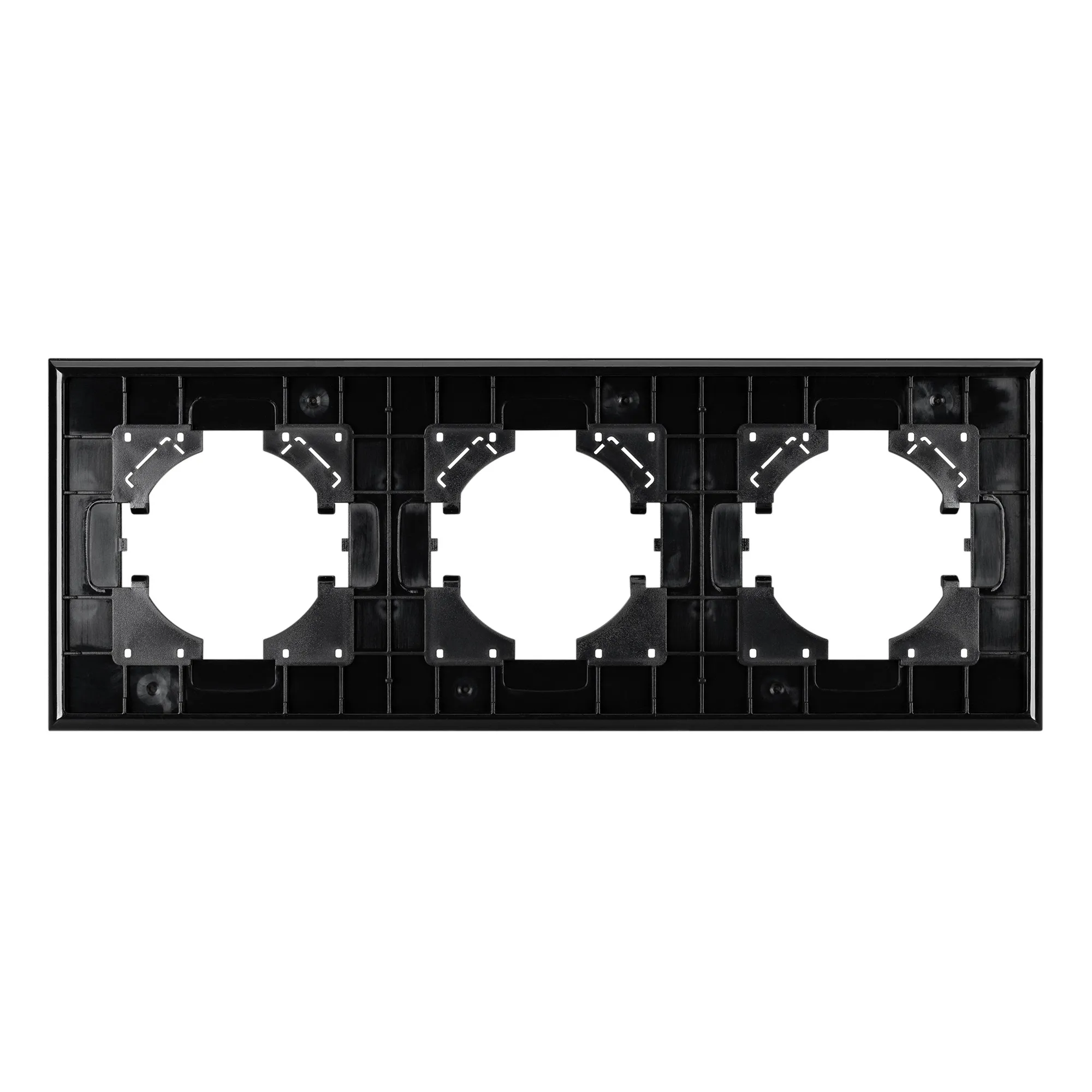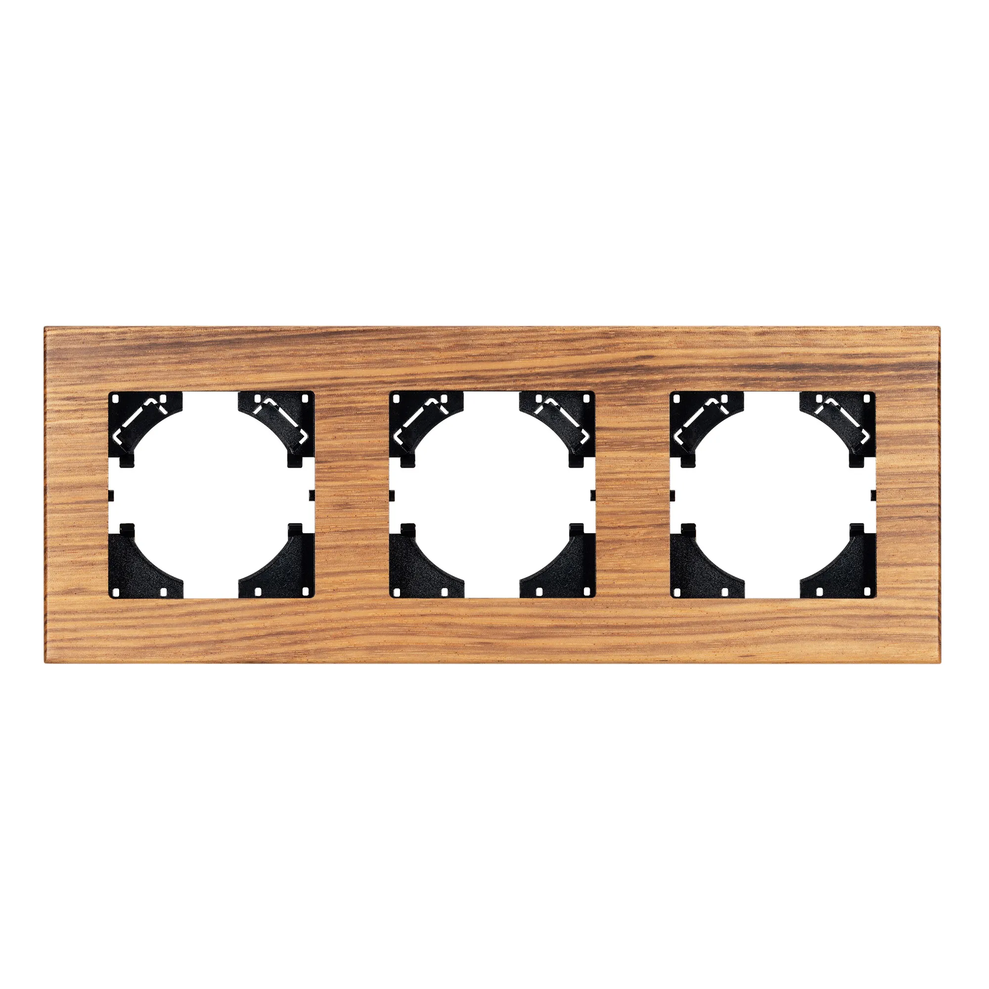 Рамка пластиковая на 3 поста, под встраиваемый механизм, с накладкой из натурального дерева. Цвет накладки - натуральное дерево* (осветленный), цвет рамки - черный. Уровень герметичности IP20. Ориентация монтажа - горизонтальная (основным ориентиром служат посадочные выступы для накладки механизма).