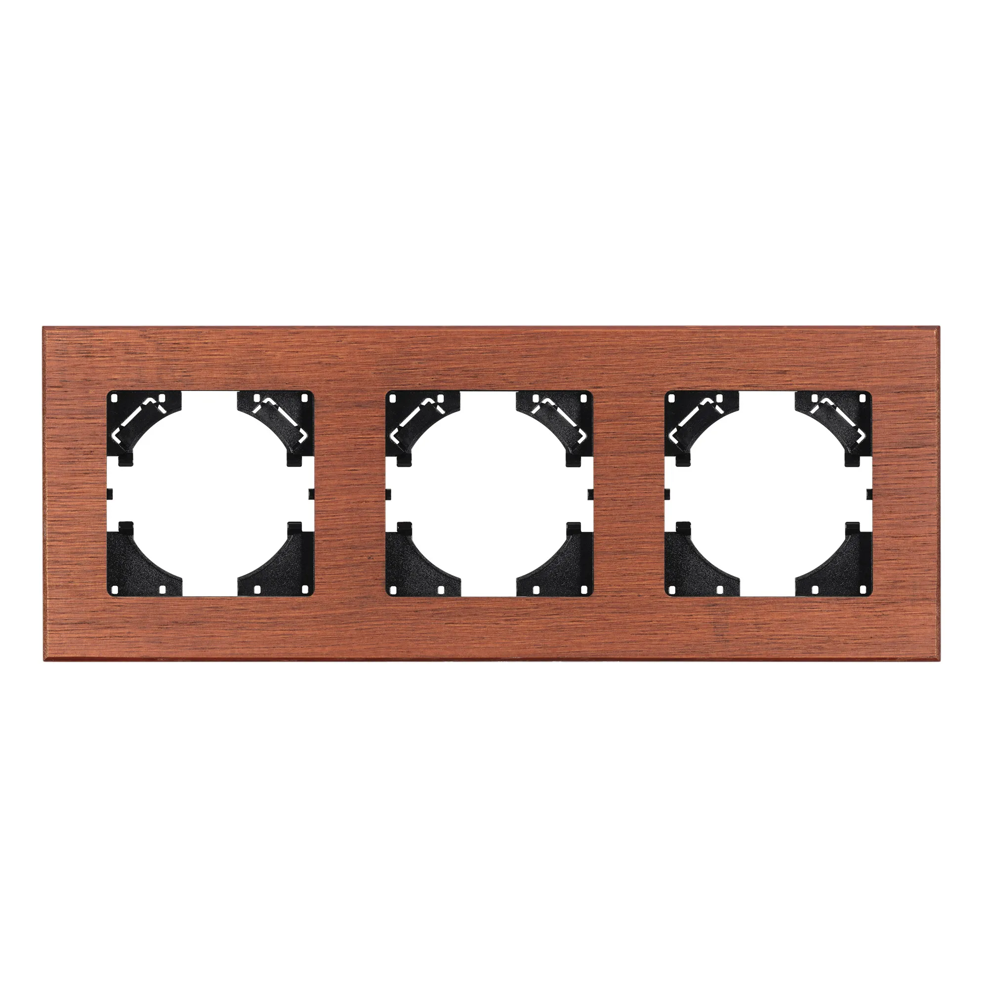 Рамка пластиковая на 3 поста, под встраиваемый механизм, с накладкой из натурального дерева. Цвет накладки - натуральное дерево*, цвет рамки - черный. Уровень герметичности IP20. Ориентация монтажа - горизонтальная (основным ориентиром служат посадочные выступы для накладки механизма).