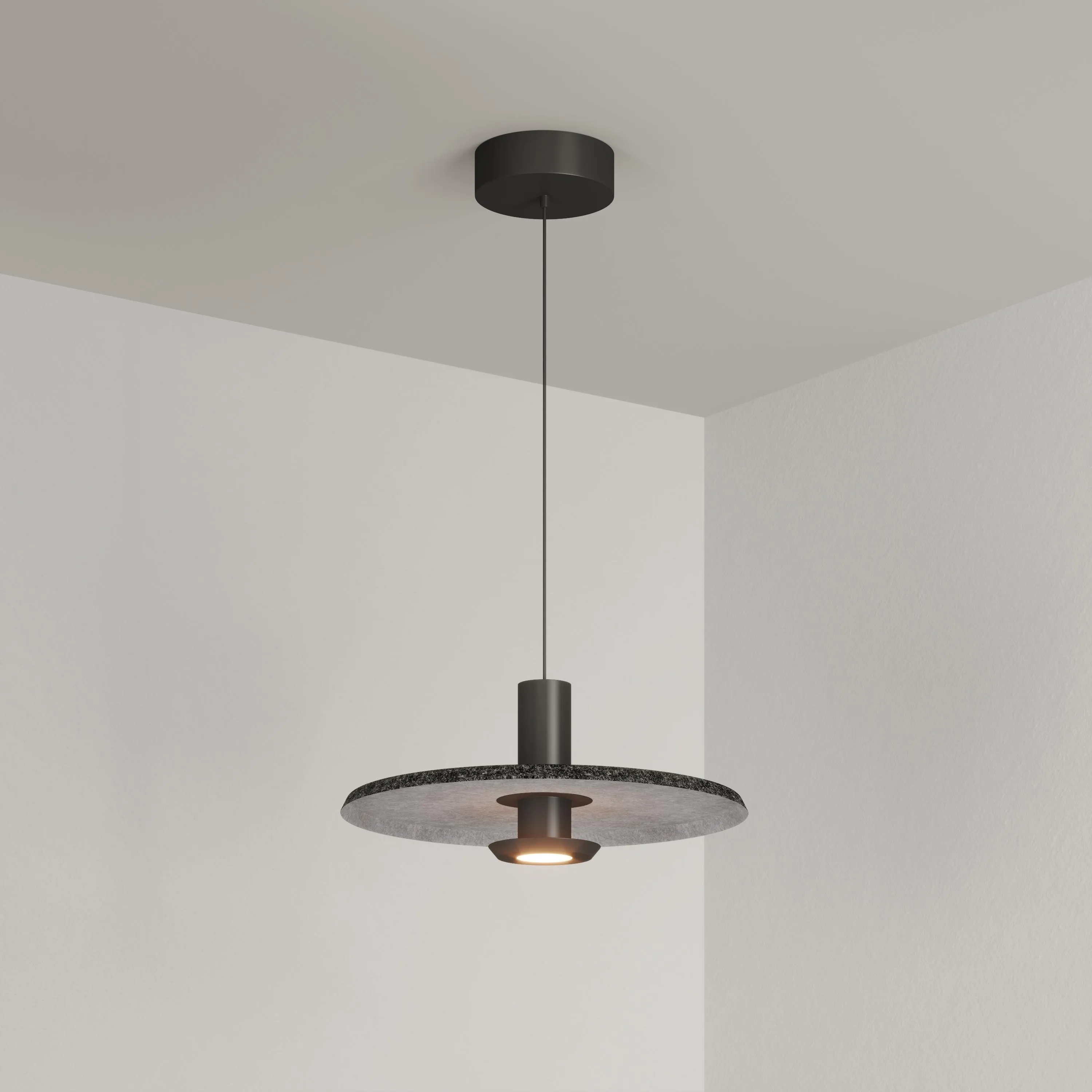 Подвесной светильник. Мощность 12 Вт, св. поток 597 лм, 49 лм/Вт, теплый 2700 K, CRI>94, угол 36°, напряжение питания 230 В. Темно-серый фигурный корпус из переработанного фетра с светло-серой внутренней поверхностью, линза-рассеиватель из PMMA, степень защиты IP20. Размер: диаметр 350 мм, высота 145 мм. Монтаж подвесной, длина подвеса 2000 мм, регулируемая. В комплекте 2 вида чаш. Габариты чаши (встраиваемая) Ø80 х 23 мм, врезное отверстие Ø60 мм. Габариты чаши (накладная) Ø120 x 35 мм. Драйвер 59 В, 300 мА, пульсация <1%. Управление по TRIAC.