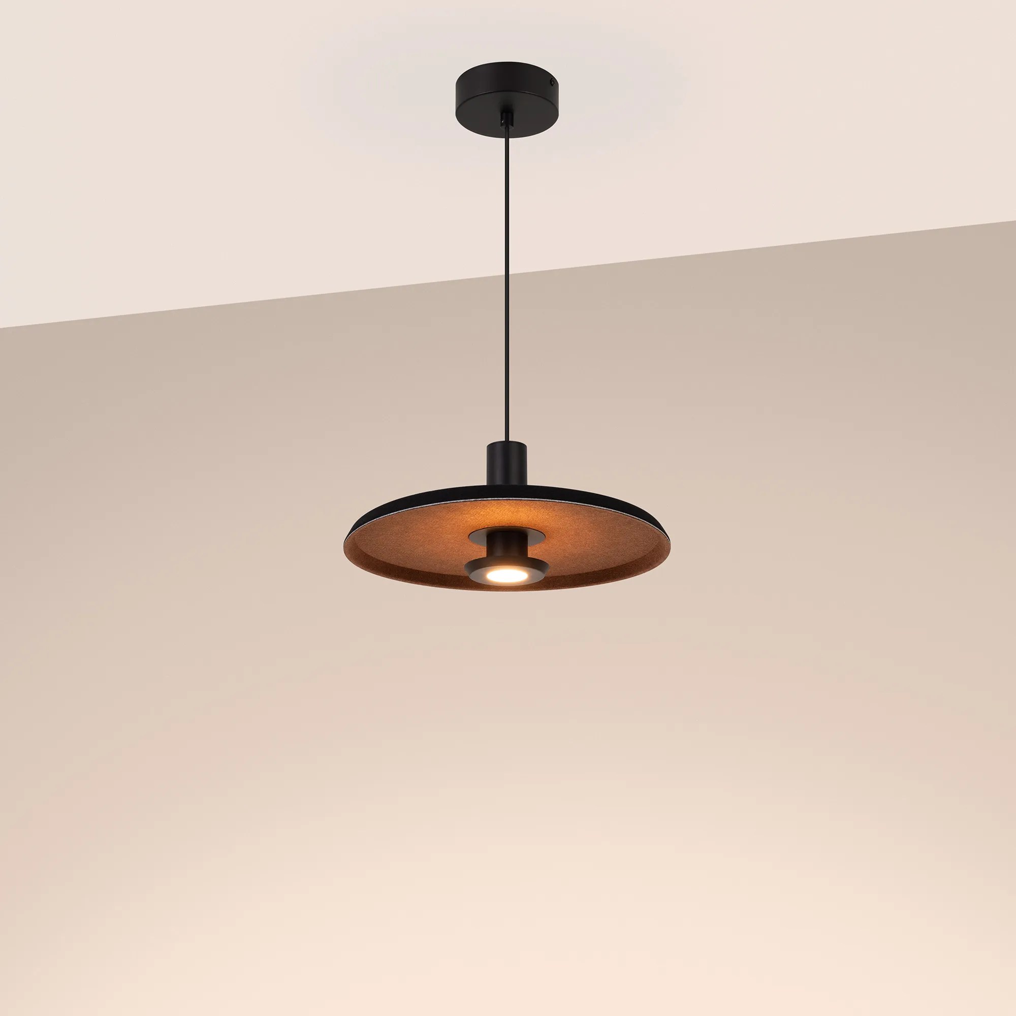 Подвесной светильник. Мощность 12 Вт, св. поток 597 лм, 49 лм/Вт, теплый 2700 K, CRI>94, угол 36°, напряжение питания 230 В. Черный фигурный корпус из переработанного фетра с внутренней поверхностью цвета мокко, линза-рассеиватель из PMMA, степень защиты IP20. Размер: диаметр 350 мм, высота 145 мм. Монтаж подвесной, длина подвеса 2000 мм, регулируемая. В комплекте 2 вида чаш. Габариты чаши (встраиваемая) Ø80 х 23 мм, врезное отверстие Ø60 мм. Габариты чаши (накладная) Ø120 x 35 мм. Драйвер 59 В, 300 мА, пульсация <1%. Управление по TRIAC.