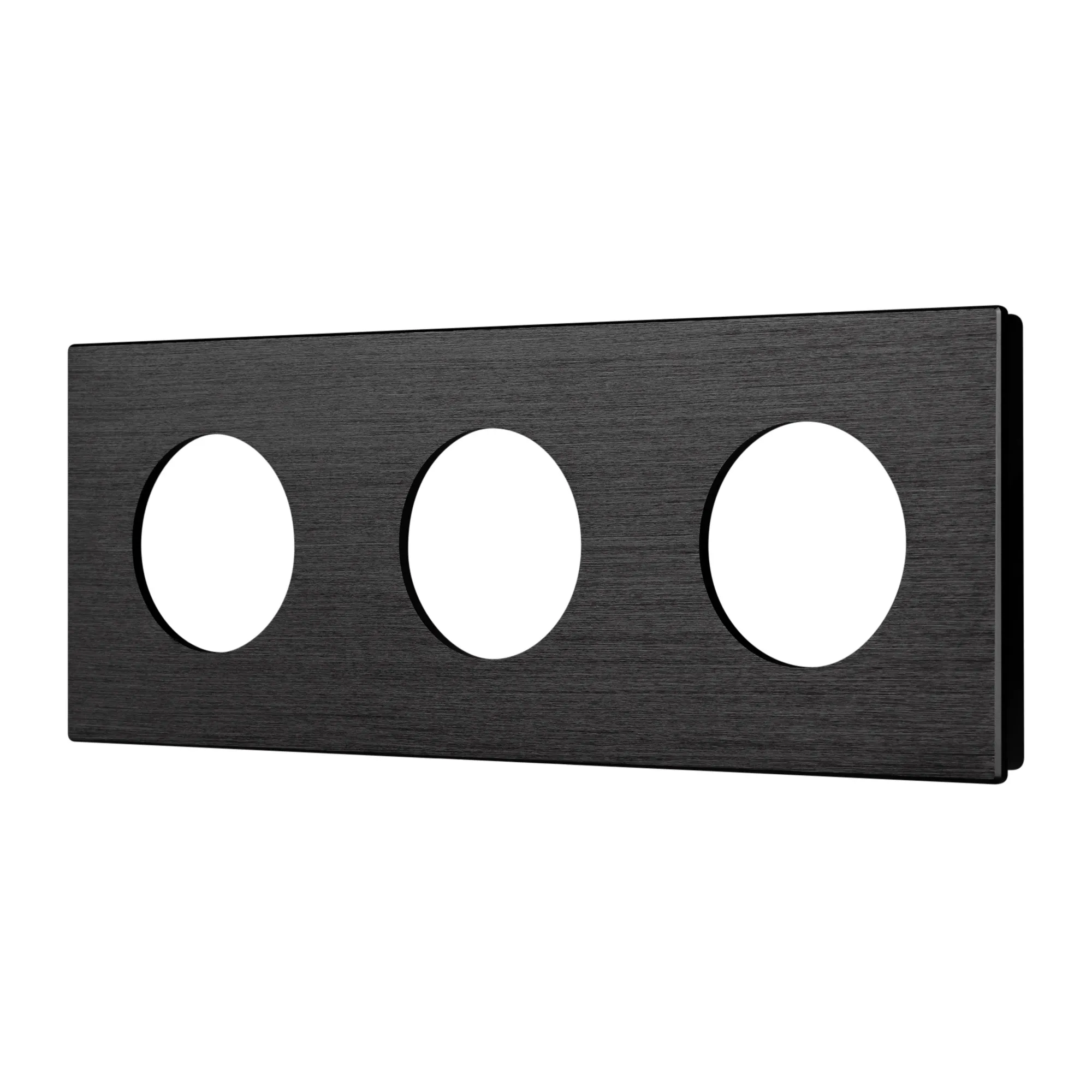 Рамка алюминиевая на 3 поста, под встраиваемый механизм. Вырез под функциональную часть - круг. Цвет - черный. Ориентации монтажа - горизонтальная и вертикальная.