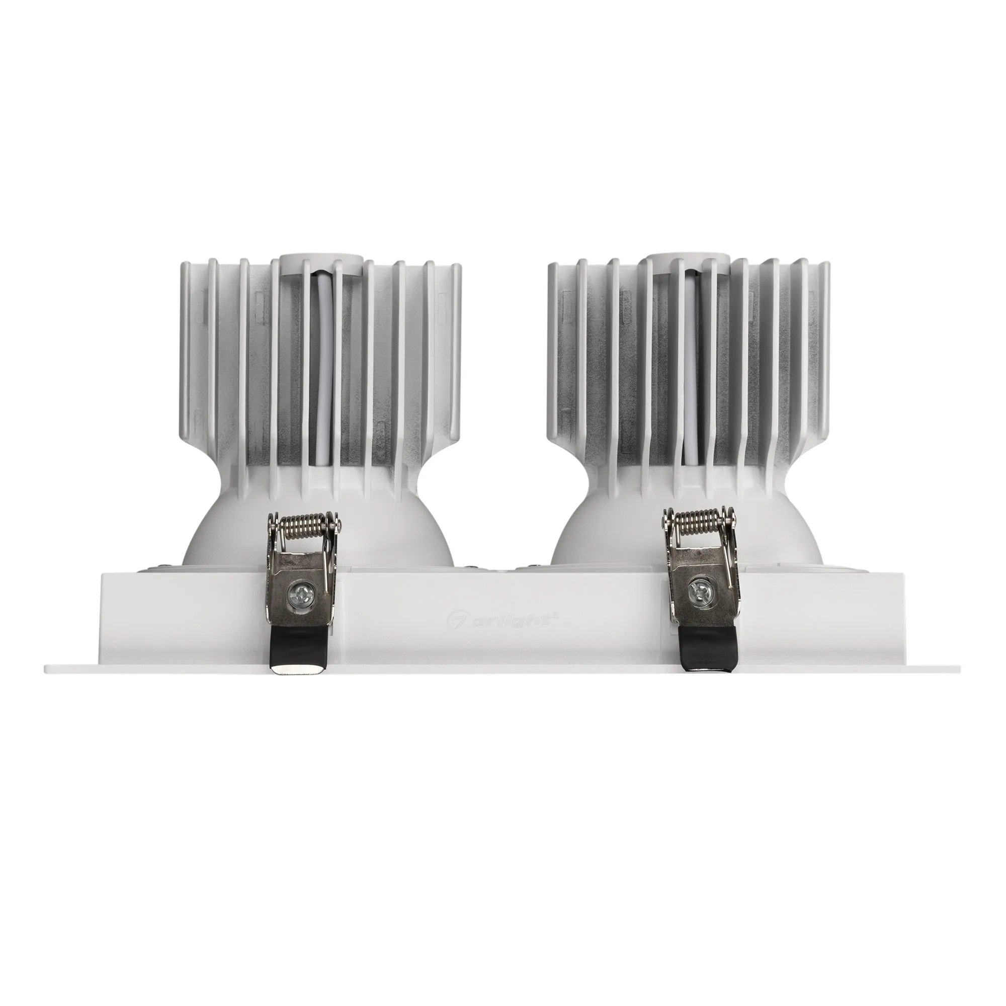 Встраиваемый карданный светильник. Мощность 2х30 Вт, св. поток 6208 лм, 103 лм/Вт, дневной 4000 K, CRI>92, угол 17°, напряжение питания 230 В. Белый корпус из алюминия, черная вставка, степень защиты IP20. Размер: длина 250 мм, ширина 140 мм, высота 125 мм. Монтаж встраиваемый, установочное отверстие: длина 230 мм, ширина 120 мм. Драйвер 24-42 В, 750 мА, пульсация <2%.