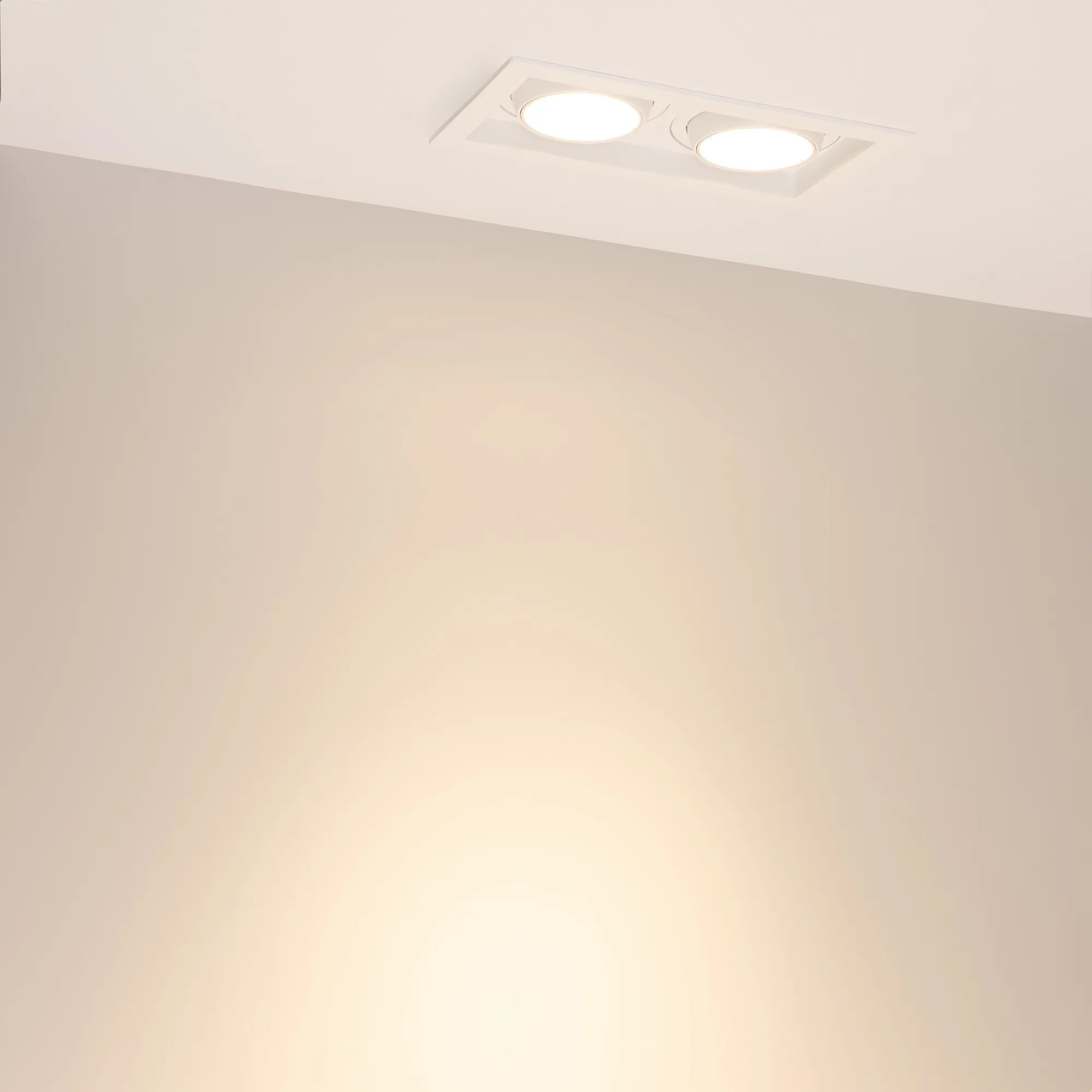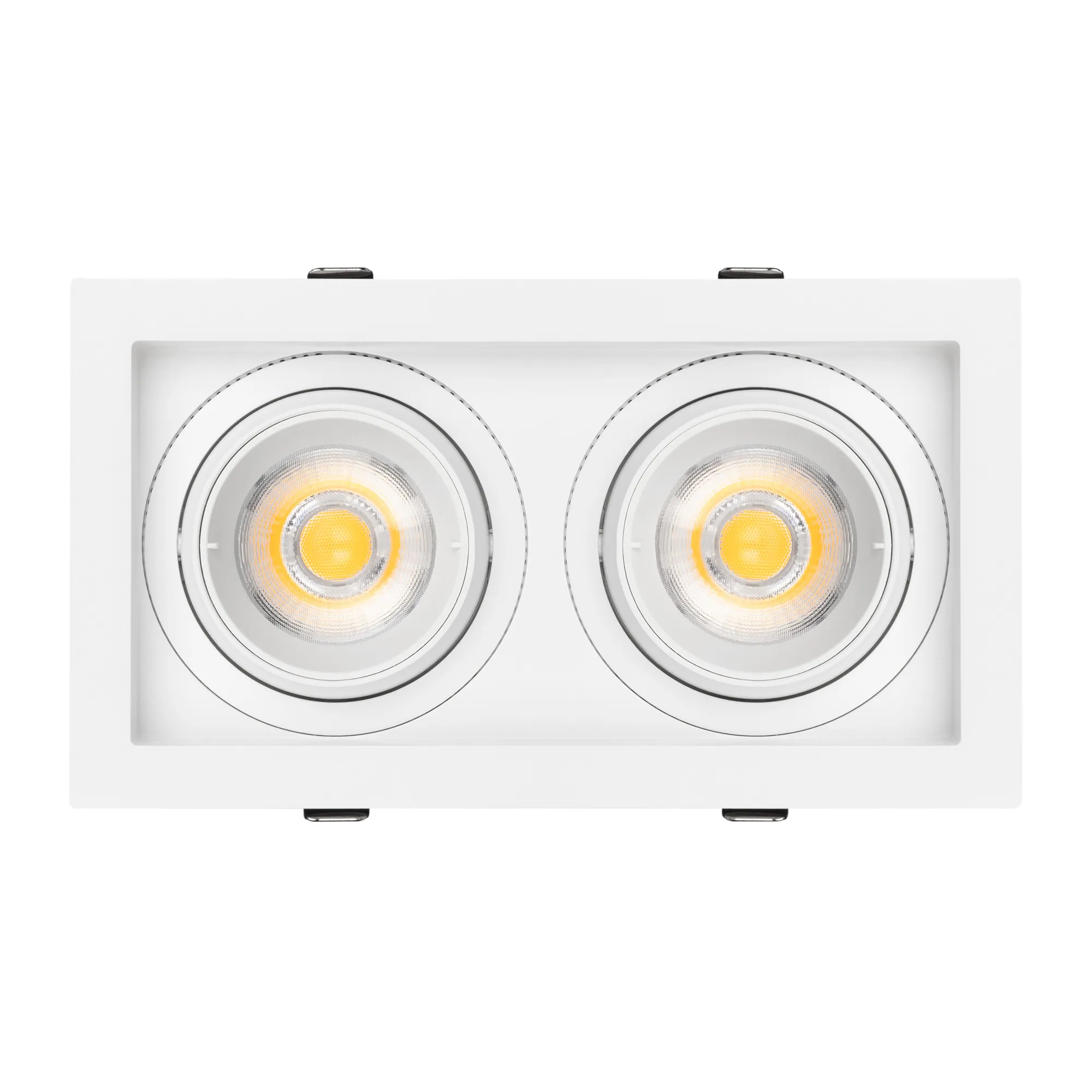 Встраиваемый карданный светильник. Мощность 2х20 Вт, св. поток 4264 лм, 106 лм/Вт, дневной 3000 K, CRI>92, угол 40°, напряжение питания 230 В. Белый корпус из алюминия, черная вставка, степень защиты IP20. Размер: длина 210 мм, ширина 117 мм, высота 105 мм. Монтаж встраиваемый, установочное отверстие: длина 190 мм, ширина 95 мм. Драйвер 24-42 В, 500 мА, пульсация <2%.