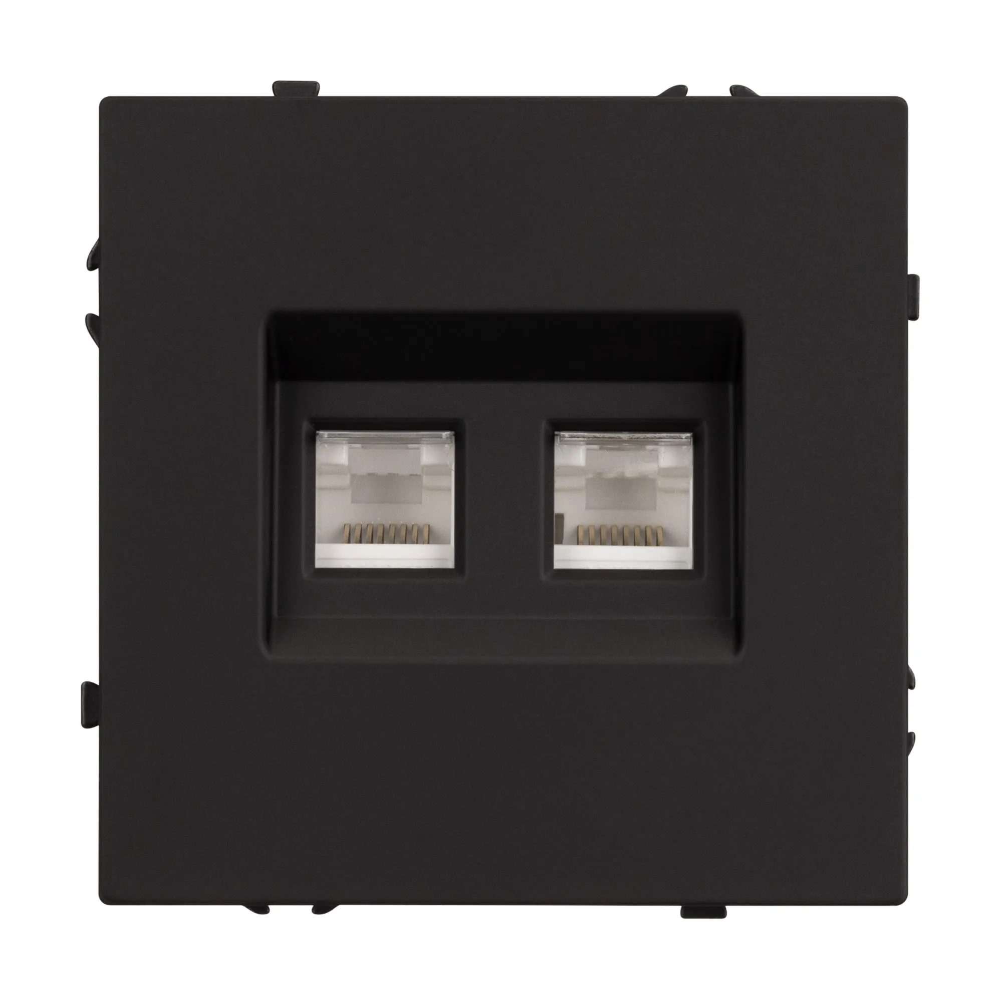 Механизм компьютерной розетки на 2 поста 6-й категории. Цвет - черный оникс, с Soft-Touch покрытием. Без фронтальной рамки. Уровень пылевлагозащиты IP20. Тип подключаемого разъема - RJ45. Розетка устанавливается в стандартный подрозетник круглого сечения диаметром 60мм.