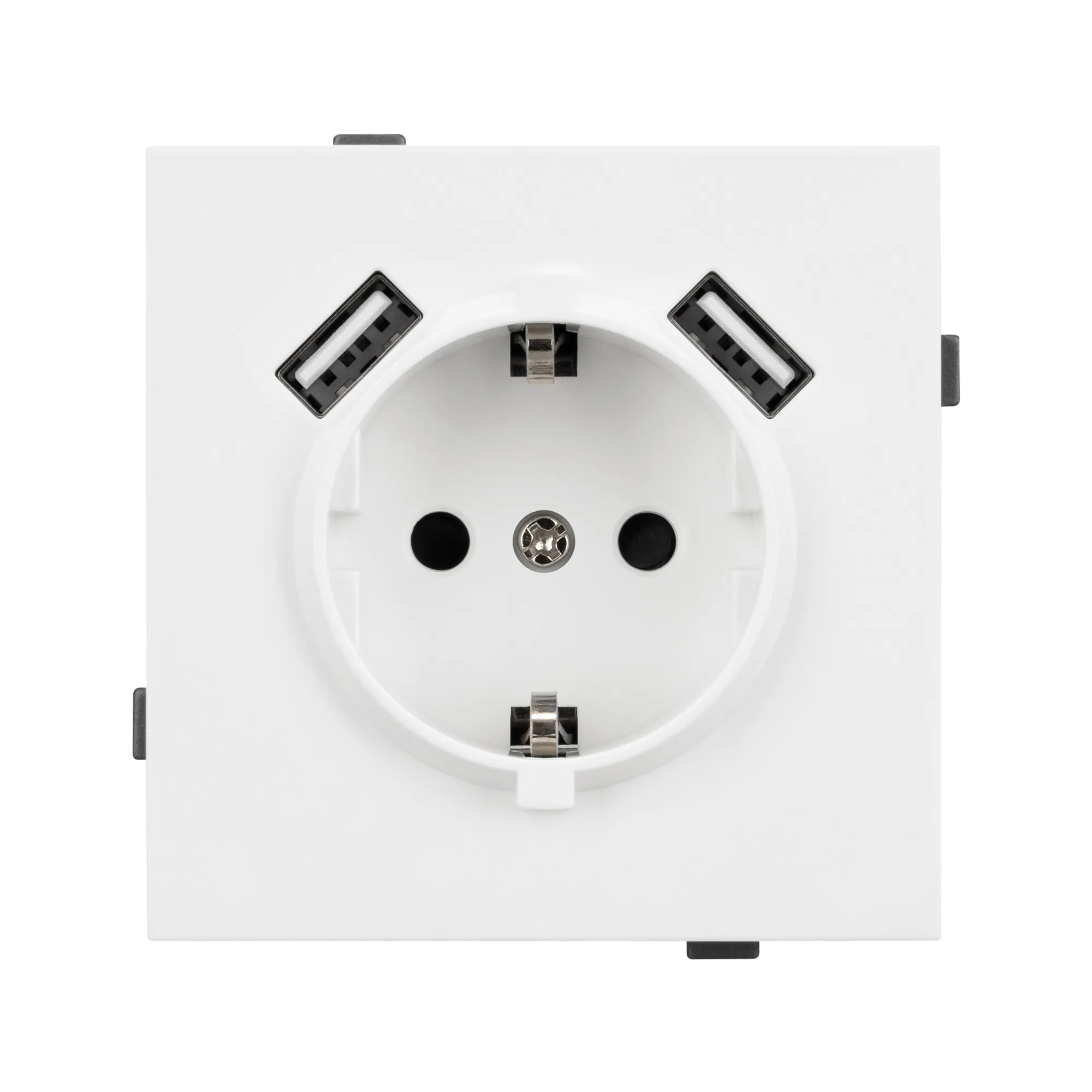 Механизм розетки с заземлением на 1 пост и 2USB Type A порта. Цвет - белый. Без фронтальной рамки. Уровень пылевлагозащиты IP20. Розетка устанавливается в стандартный подрозетник круглого сечения диаметром 60мм.