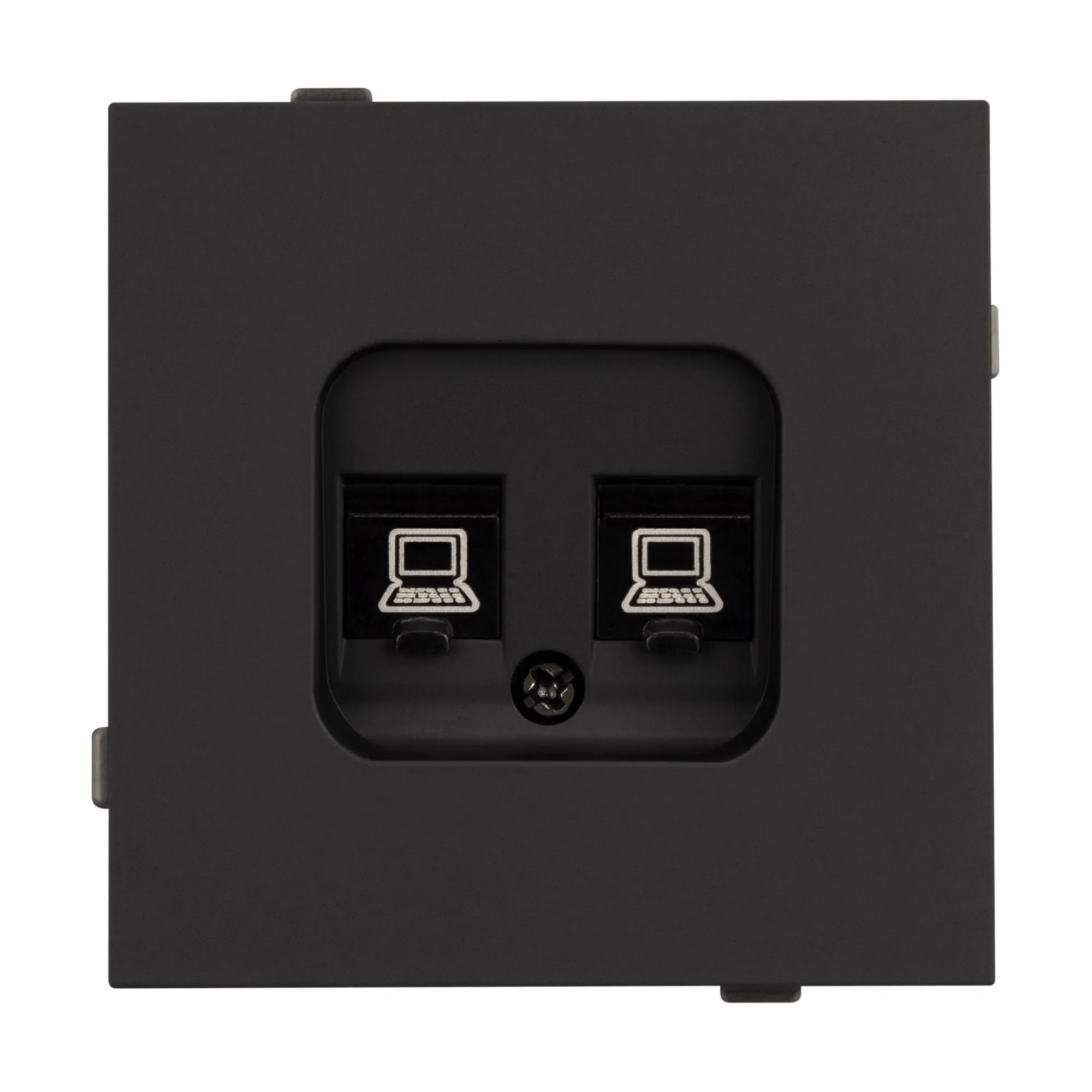 Механизм компьютерной розетки на 2 поста 6-й категории. Цвет - матовый черный, с Soft-Touch покрытием. Без фронтальной рамки. Уровень пылевлагозащиты IP20. Розетка устанавливается в стандартный подрозетник круглого сечения диаметром 60мм.
