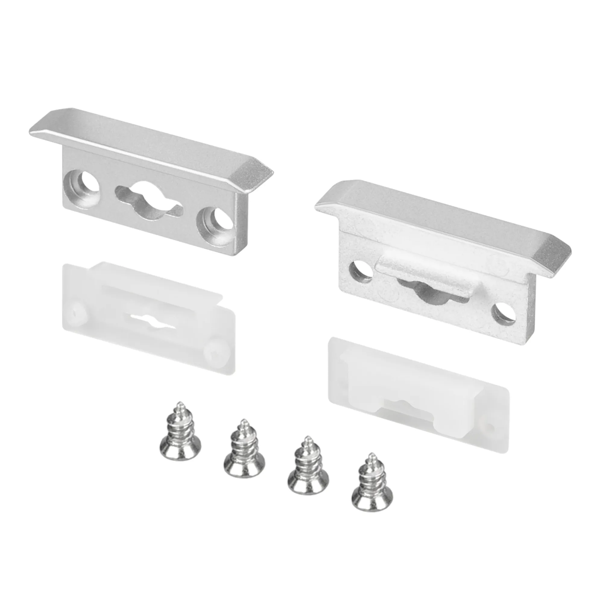 Пара пластиковых заглушек с отверстиями для профиля FLOOR27-H11-F. Цвет - серебристый. В комплекте: заглушка c отверстием - 2 шт., силиконовая прокладка - 2 шт., винт - 4 шт. Цена за комплект.