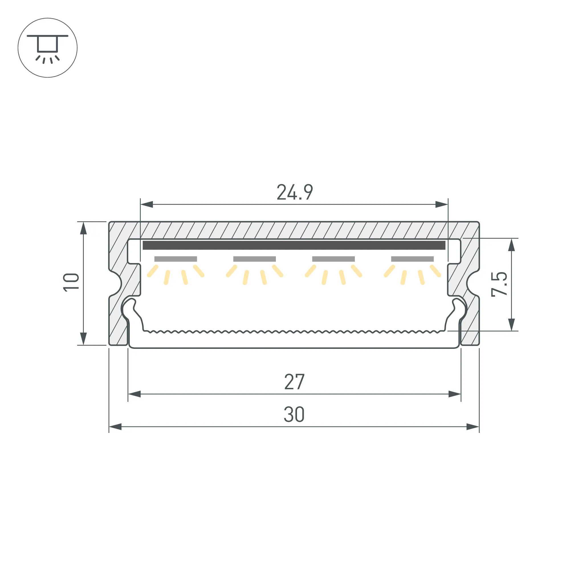 Алюминиевый анодированный накладной профиль для светодиодных лент и линеек. Габаритные размеры (L×W×H): 2000x30x10 мм. Ширина площадки для ленты 24,9 мм. Экраны, заглушки и другие аксессуары приобретаются отдельно. Цена за 1 метр.