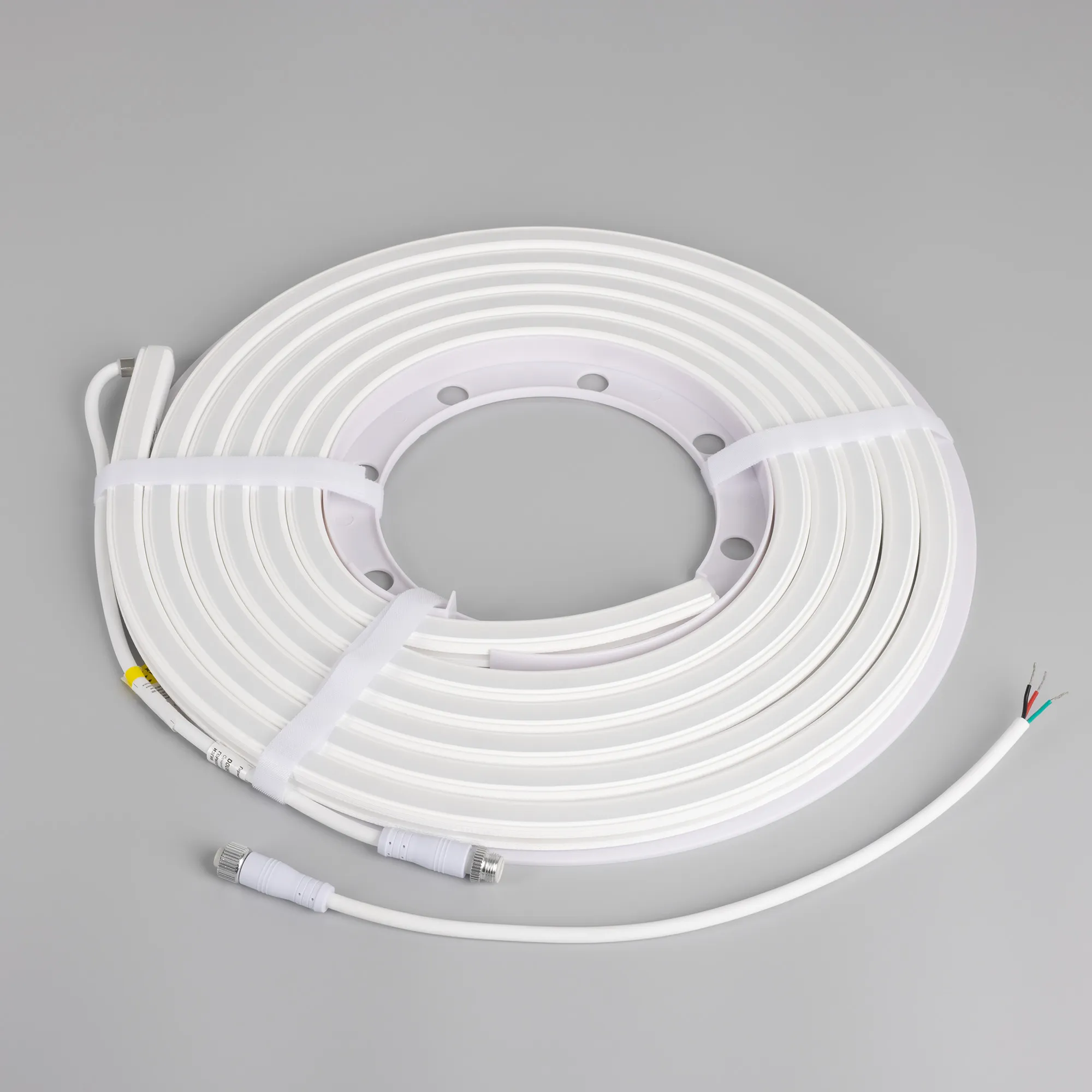 Гибкая герметичная лента (неон серии WAVE), сечение 16×15 мм. Светодиоды SMD5060 + SMD2835 168 шт/м. Цвет свечения RGB + ДНЕВНОЙ (4000 К), SPI (микросхема UCS2904, 12 пикселей/метр), угол излучения 292°. Мощность 15 Вт/м, питание 24 В. Класс пылевлагозащиты IP67. Размеры 5000×16×15 мм. Мин. отрезок 83.3 мм. Горизонтальный изгиб SIDE, свечение в две стороны, минимальный радиус изгиба 100 мм. Вывод кабеля с одной стороны перпендикулярно линии сечения неона. Катушка 5 м. Цена за 1 м. Гарантия 5 лет.