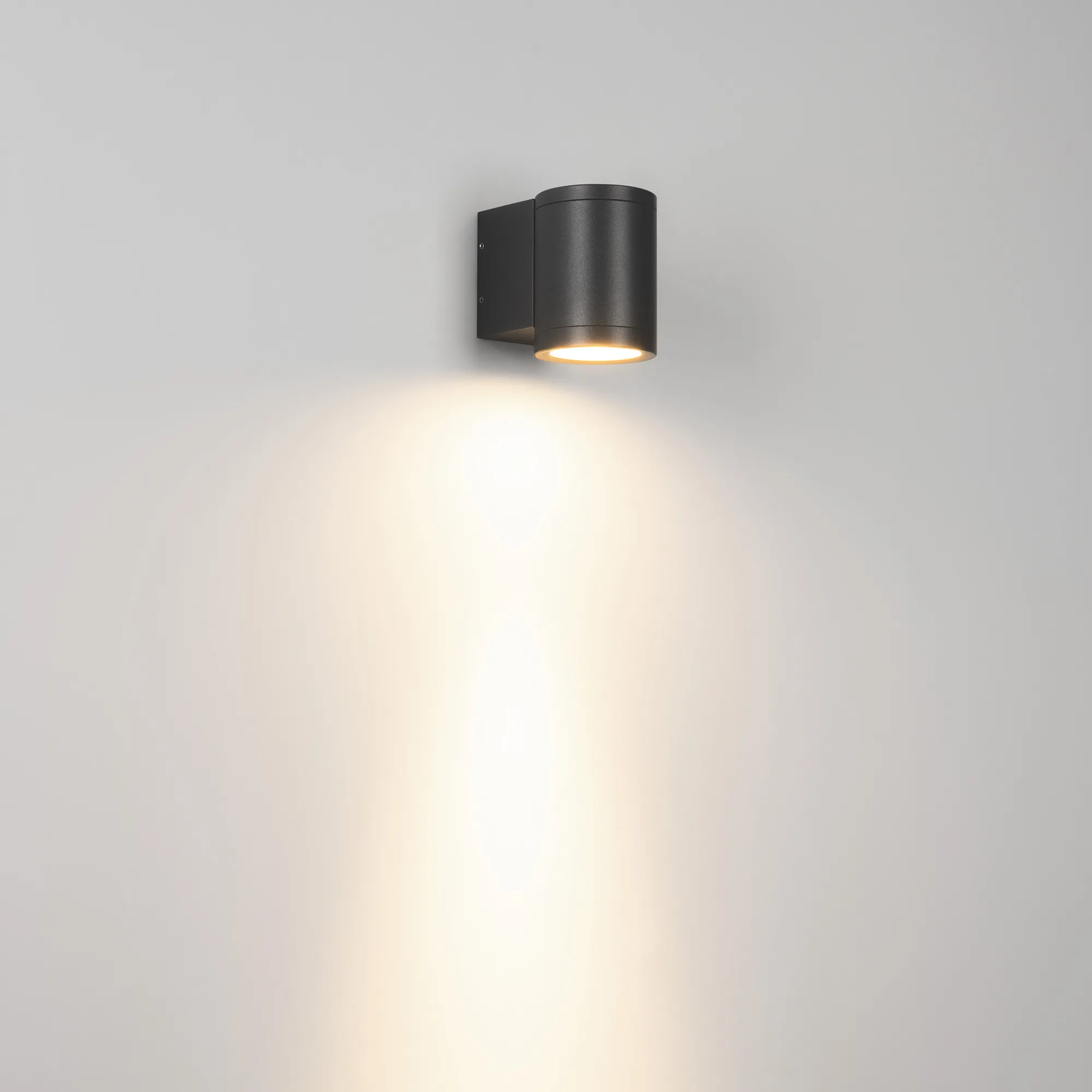 Накладной настенный светильник. Мощность 9 Вт, св. поток 860 лм, 95 лм/Вт, теплый 4000 K, CRI>80, угол 23°, напряжение питания 230 В. Темно-серый фигурный корпус из алюминия, экран стекло, степень защиты IP65. Размер: длина 98 мм, ширина 65 мм, высота 85 мм. Монтаж накладной. Драйвер встроенный, пульсация <2%.