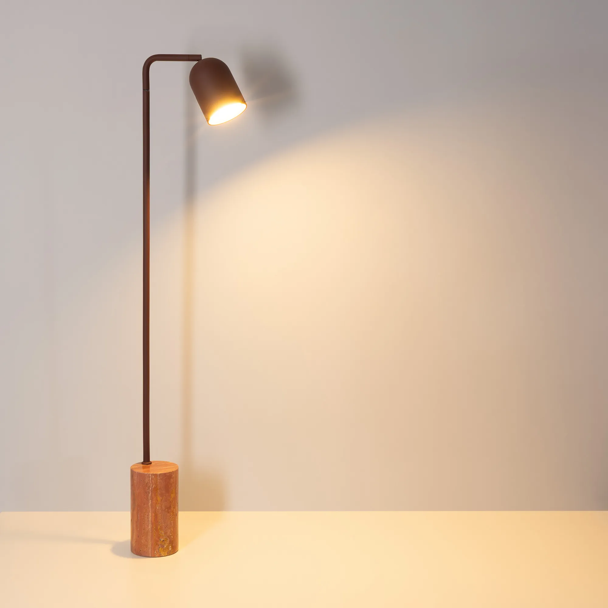 Напольный светильник MASON. Мощность 6 Вт, световой поток 530 лм, световая эффективность - 88 лм/Вт, с изменяемой цветовой температурой 2700/3200/4000K, CRI>90, угол 120°, напряжение питания 230 В. Корпус цвета бургунди из алюминия, напольная база из натурального камня (красный травертин). Сенсорная кнопка на плафоне для настройки яркости и цветовой температуры. Степень пылевлагозащиты: IP20. Размеры: диаметр плафона 120 мм, высота плафона 170 мм, диаметр напольной базы 140 мм, общая высота светильника 1430 мм. Цвет и текстура камня могут отличаться.